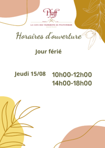 14 Août 2024 Horaires 15 Août Notre caveau est ouvert le jeudi 15 Août De 10h à 12H et de 14H à 18h00