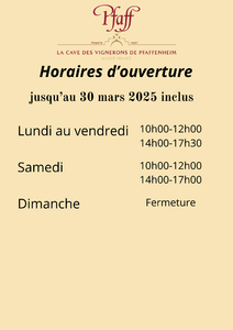 Horaires d'ouverture jusqu'au 30 mars 2025 inclus
