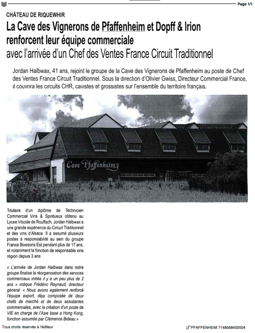Fermer La Cave des Vignerons de Pfaffenheim et Dopff & Irion renforcent leur équipe commerciale Renforcement de notre équipe commerciale avec l'arrivée d'un Chef des Ventes France Circuit Traditionnel Télécharger
