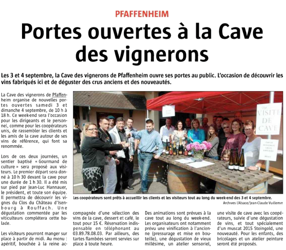 Article du quotidien "l'Alsace", sur nos portes ouvertes qui auront lieux à la Cave des Vignerons de Pfaffenheim les 3 et 4 septembre prochain.